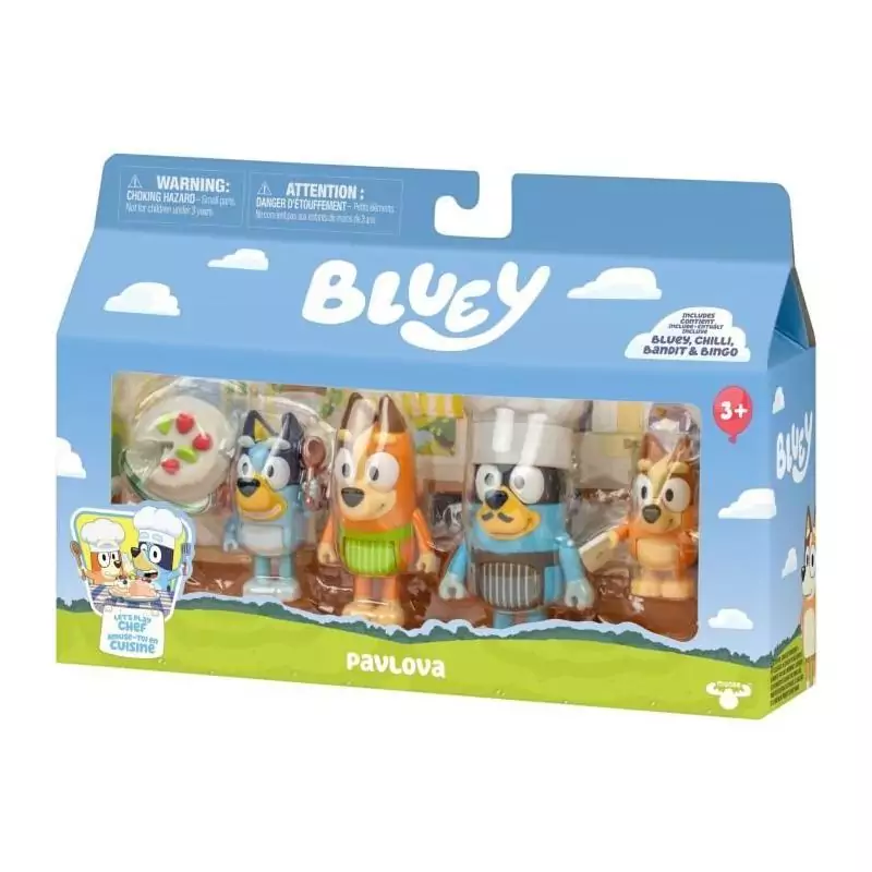 Le Pack de 4 figurines - BLUEY - La famille en cuisine est un ensemble de figurines adorable mettant en scène la famille Bluey dans leur cuisine. Avec ce pack, les enfants pourront recréer des scènes amusantes et inventer de nouvelles aventures culinaires avec Bluey, Bingo, Bandit et Chilli.