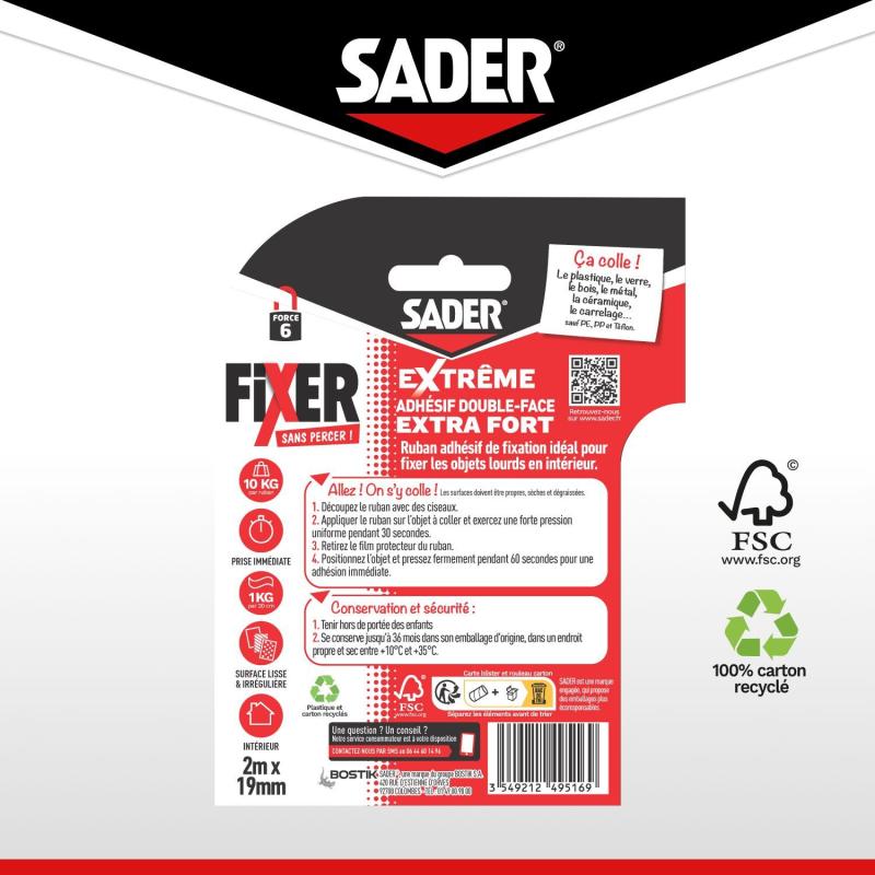 Adhésif double face extra fort - SADER - Fixer sans percer - Extreme - Intérieur - Supporte jusqu'a 10 Kg - Blanc - 2 m x 19 m