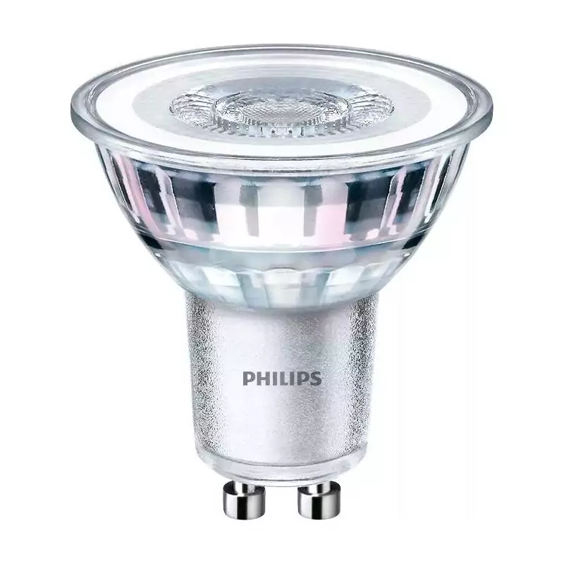 Philips Spot 50 W PAR16 GU10. Puissance de l'ampoule: 4,6 W, Puissance ampoule équivalente: 50 W, Type de culot: GU10, Flux lumineux: 355 lm, Durée de vie de la lampe: 15000 h, Couleur de la lumière: Blanc chaud, Température de couleur: 2700 K, Angle du faisceau: 36°, Indice de rendu des couleurs (IRC): 80, Facteur de puissance: 0,5