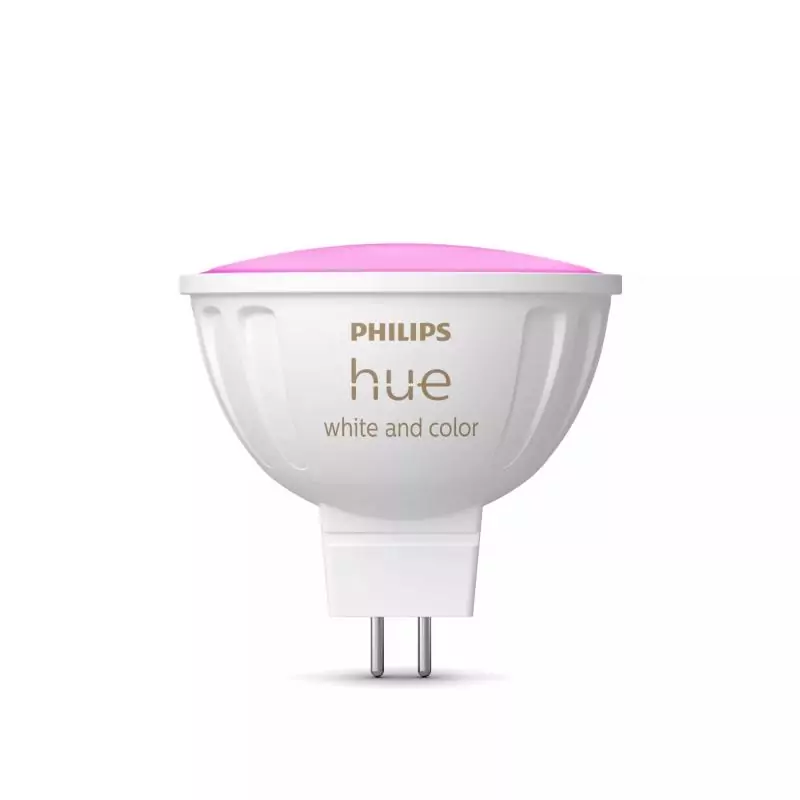 Philips Hue White and Color ambiance MR16 - Spots connectés. Type: Ampoule intelligente, Interface: Bluetooth/Zigbee, Couleur du produit: Blanc. Classe d'efficacité énergétique: G, Consommation d'énergie (mode veille): 0,5 W, Consommation (max): 6,3 W. Hauteur: 49 mm, Poids: 47 g, Diamètre: 5 cm. Type d'emballage: Boîte, Largeur du colis: 72 mm, Profondeur du colis: 72 mm. Quantité: 2 pièce(s), Nombre d’ampoule(s) de teinte incluse(s): 1 ampoule(s)