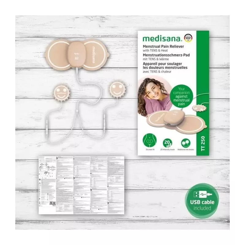 Découvrez l'Appareil soulageant les douleurs menstruelles MEDISANA TT 250 TENS avec 4 électrodes, spécialement conçu pour soulager les douleurs au ventre et au dos pendant la période menstruelle.