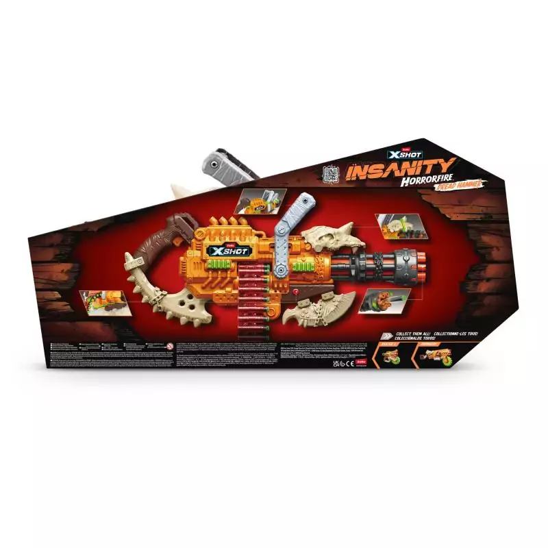 XSHOT Insanity HorrorFire Dread Hammer est le plus grand et le plus terrifiant des pistolets de la gamme Insanity HorrorFire ! Avec ce blaster équipé d'une ceinture de 35 fléchettes, tu es prêt à faire face à tous les tirs de la bataille ! Incluant 48 fléchettes avec technologie Air Pocket pour des tirs précis d'une portée allant jusqu’à 27 m ! Combine toute la gamme Insanity pour créer un méga combo de blasters !