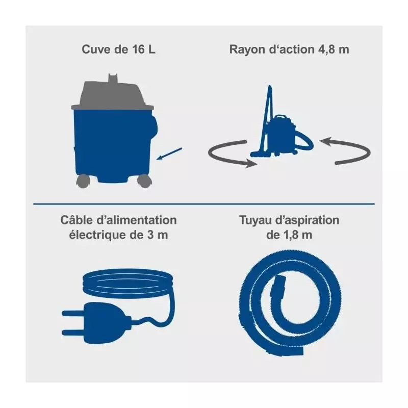L'aspirateur eau et poussière VC16 est équipé de fonctions avancées telles qu'un système de filtration performant qui retient les particules fines et allergènes, assurant ainsi un air purifié lors de vos sessions de nettoyage. De plus, sa facilité d'utilisation et sa maniabilité vous permettent d'atteindre les zones les plus difficiles d'accès sans effort.