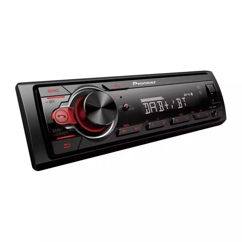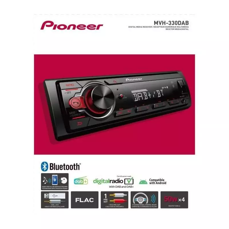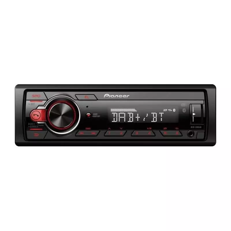 Pioneer MVH-330DAB - Autoradio 1 DIN Compact. Le Pioneer MVH-330DAB est un autoradio au format 1 DIN, conçu pour offrir une connectivité moderne et une qualité audio optimale. Connectivité et communication: Kit mains-libres Bluetooth® avec microphone déporté pour des appels clairs et sécurisés. Streaming audio Bluetooth® pour écouter votre musique sans fil a partir de votre smartphone. Radio numérique DAB+ et sources audio variées : Tuner FM et DAB+ pour profiter de la radio avec une qualité audio numérique et sans interférences. Entrée USB en façade pour lire vos fichiers audio via une clé USB. Entrée auxiliaire pour connecter facilement d'autres sources audio. Format 1 DIN compact et facile a installer.