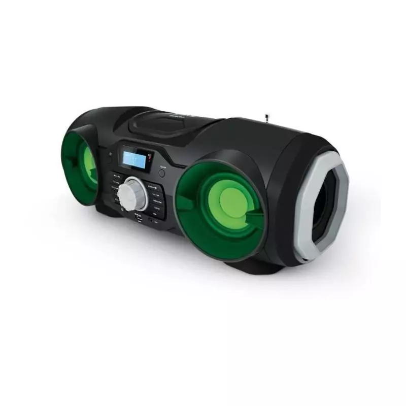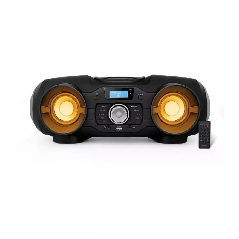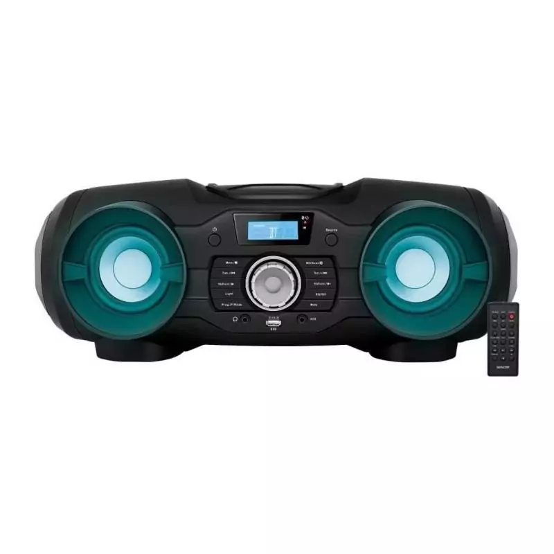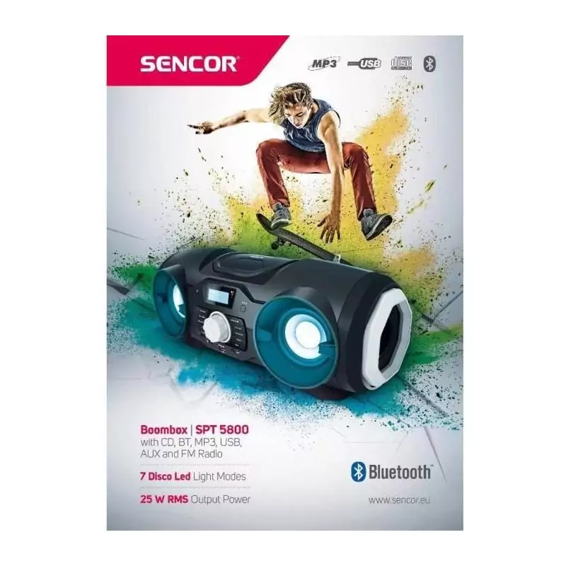 Boombox avec CD, BT, MP3, USB, AUX et radio FM Sencor SPT 5800 - Puissance de sortie : 25 W RMS (2 x 12,5 W) Deux haut-parleurs actifs de 4 ohms 4" Deux haut-parleurs passifs pour augmenter l'effet sonore des basses Mode d'éclairage LED Disco (7 couleurs) avec sélection de modes clignotants Fonction égaliseur (Rock, Pop, Jazz, Flat, Classic) Surface caoutchoutée Télécommande Compatible CD-R / RW, Bluetooth, MP3 et USB Lecture programmable avec mémoire de 20 pistes pour CD et mémoire de 99 pistes pour MP3 Bluetooth V2.1 + EDR Interface USB Prise AUX-IN 3,5 mm Prise AUX-OUT 3,5 mm (casque) Récepteur FM stéréo 87,5 - 108 MHz Mémoire préréglée - 30 canaux dans la bande FM Poids : 3,4 kg