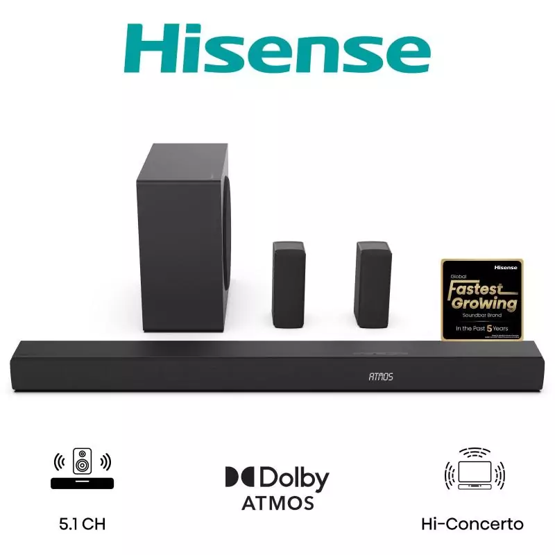 Barre de son - HISENSE - AX5100Q - 5.1.2 Canaux - Dolby Atmos & DTS:X - 340W - Caisson et enceintes arriere sans fil