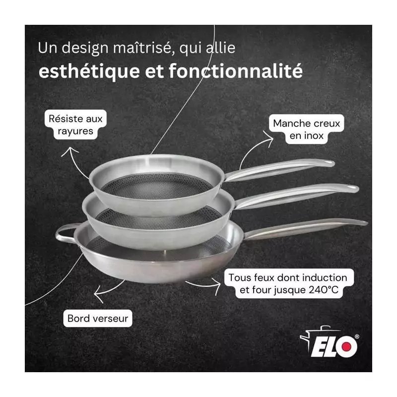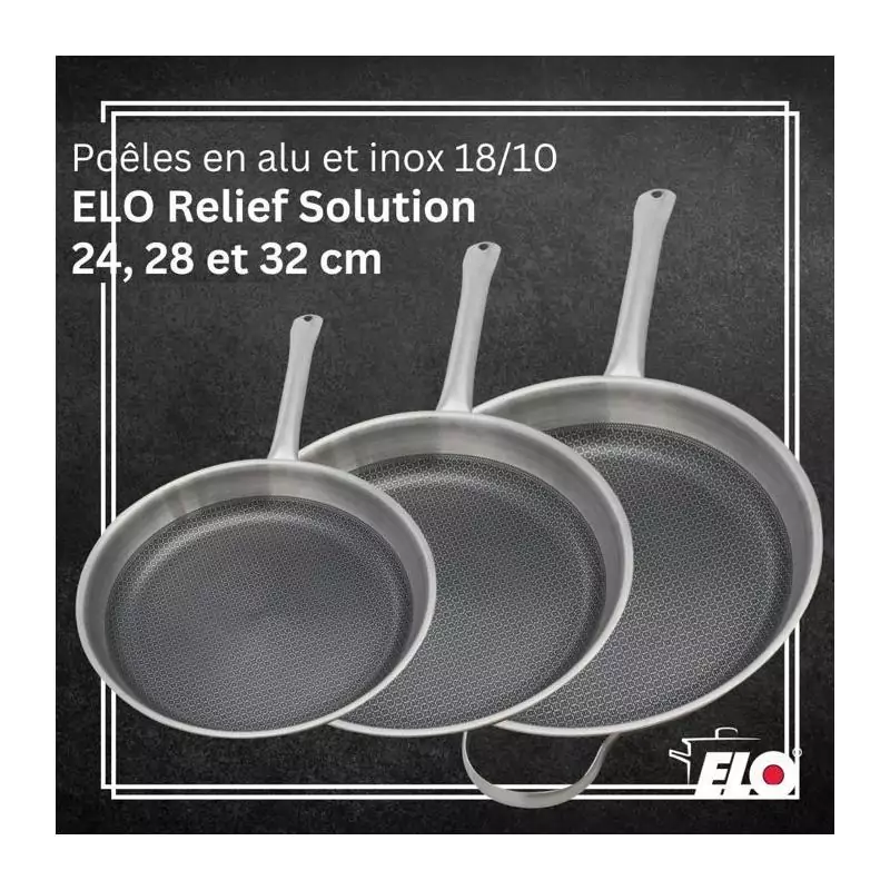 Set de 3 poeles a induction - ELO - Relief Solutions - Inox 18/10 ELODUR Select antiadhésives - Ø 24-28-32 cm
