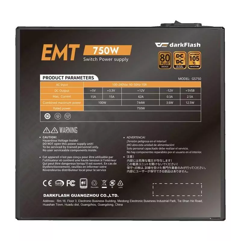 La DARKFLASH EMT est une alimentation PC interne non modulaire dotée d'une puissance de 750 W et certifiée 80Plus Bronze. Conçue pour offrir des performances fiables et efficaces, cette alimentation est un choix idéal pour les utilisateurs exigeants en matière de puissance et de qualité.