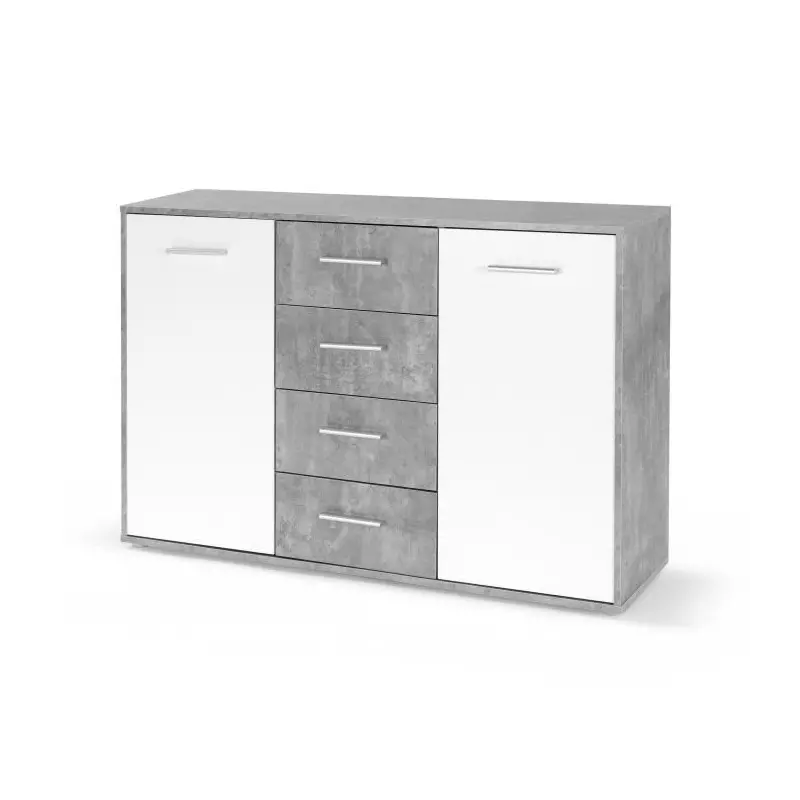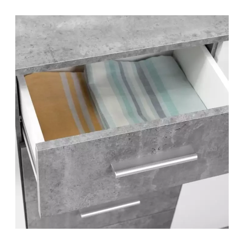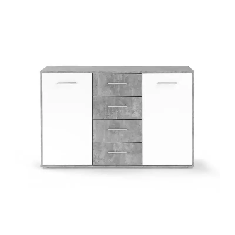 Sa couleur blanc et béton clair lui confère un design sobre et raffiné, s'intégrant facilement à différents styles de décoration. Ses dimensions de L 122,6 x P 34,2 x H 81,1 cm en font un meuble compact, idéal pour les espaces restreints tout en offrant une capacité de stockage généreuse.