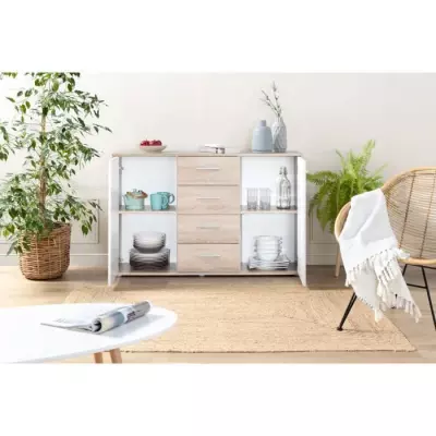 Le Buffet bas PILVI est un meuble à la fois élégant et fonctionnel qui apportera une touche moderne à votre intérieur. Avec ses 2 portes et 4 tiroirs, il offre un espace de rangement généreux pour vos ustensiles de cuisine, vaisselle, et autres objets du quotidien.