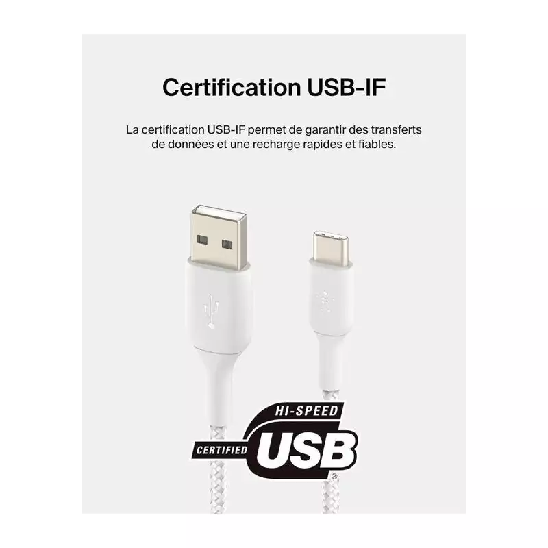 Ne laissez pas un câble ordinaire limiter votre productivité. Optez pour le câble tressé BELKIN USB-C vers USB-A de 0,15 m en blanc pour une expérience de chargement et de transfert de données sans faille. Faites le choix de la qualité et de la fiabilité avec BELKIN.
