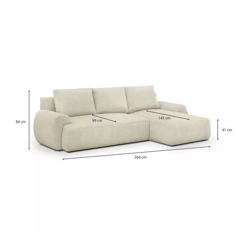 Avec des dimensions de L 264 x H 84 x P 99/145 cm, ce canapé offre amplement d'espace pour vous détendre confortablement ou accueillir des invités. Son angle droit le rend parfait pour les espaces plus grands, tandis que sa fonction convertible vous permet de le transformer en un lit spacieux pour les soirées pyjama improvisées ou les invités imprévus.
