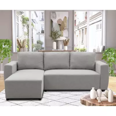 Le revêtement en tissu souris ajoute une touche de sophistication, tandis que sa forme en angle permet de maximiser l'espace disponible. Ce canapé offre non seulement un confort optimal pour vous et vos invités, mais il se transforme également en un lit confortable pour les nuitées imprévues.