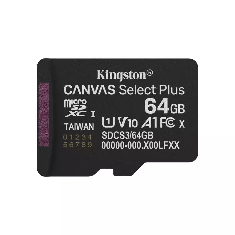 Kingston Technology 64GB microSDXC Canvas Select Plus Gen3 100MB/s A1 (Adaptateur SD inclus). Capacité: 64 Go, Type de Carte Flash: MicroSDXC, Classe de mémoire Flash: Classe 10, Type de mémoire interne: UHS-I, Vitesse de lecture: 100 Mo/s, Classe de vitesse UHS: Class 1 (U1), Classe de vitesse vidéo: V10. Couleur du produit: Noir