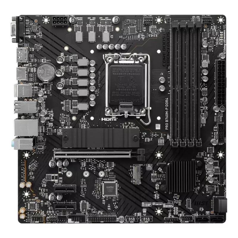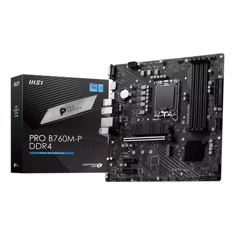 MSI PRO B760M-P DDR4. Fabricant de processeur: Intel, Socket de processeur (réceptable de processeur): LGA 1700, Processeurs compatibles: Intel® Celeron®, Intel® Pentium® Gold. Types de mémoire pris en charge: DDR4-SDRAM, Mémoire interne maximale: 128 Go, Type de support (slot): DIMM. Interfaces de lecteur de stockage prises en charge: M.2, SATA III, Niveaux RAID: 0, 1, 5, 10. Type d'interface Ethernet: 2.5 Gigabit Ethernet. composant pour: PC, Elément de forme de carte mère: micro ATX, famille de composant de produits: Intel