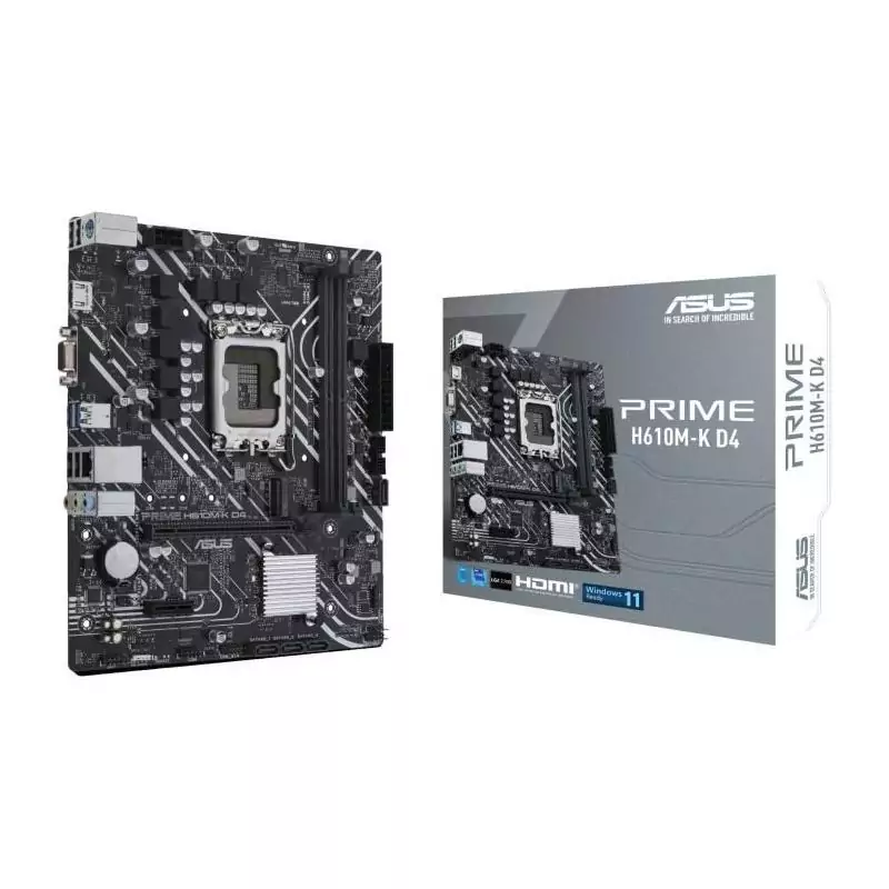 ASUS PRIME H610M-K D4. Fabricant de processeur: Intel, Socket de processeur (réceptable de processeur): LGA 1700, Processeurs compatibles: Intel® Celeron®, Intel® Core™ i3, Intel® Core™ i5, Intel® Core™ i7, Intel® Core™ i9,.... Types de mémoire pris en charge: DDR4-SDRAM, Mémoire interne maximale: 64 Go, Type de support (slot): DIMM. Interfaces de lecteur de stockage prises en charge: M.2, SATA, Types de lecteurs de stockage pris en charge: HDD & SSD, Niveaux RAID: 0, 1, 5, 10. Type d'interface Ethernet: Gigabit Ethernet. composant pour: PC, Elément de forme de carte mère: micro ATX, famille de composant de produits: Intel