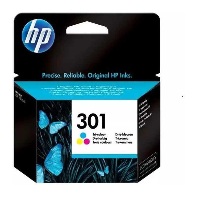HP 301 cartouche d'encre trois couleurs authentique. Type d’encre de couleur: Encre à colorant, Type de cartouche d'encre: Rendement standard, Rendement par page d'encre de couleur: 150 pages, Volume d'encre de couleur: 3 ml, Couleurs d'impression: Cyan, Magenta, Jaune, Quantité: 1 pièce(s)