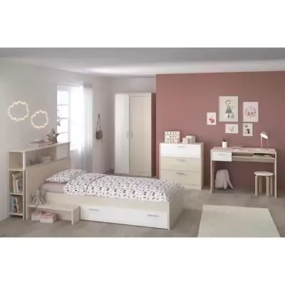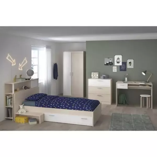 PARISOT Chambre enfant complete - Tete de lit + lit + commode + armoire + bureau - contemporain - Décor acacia clair et blanc