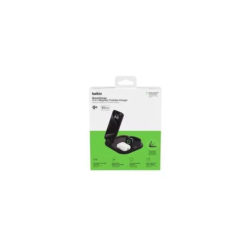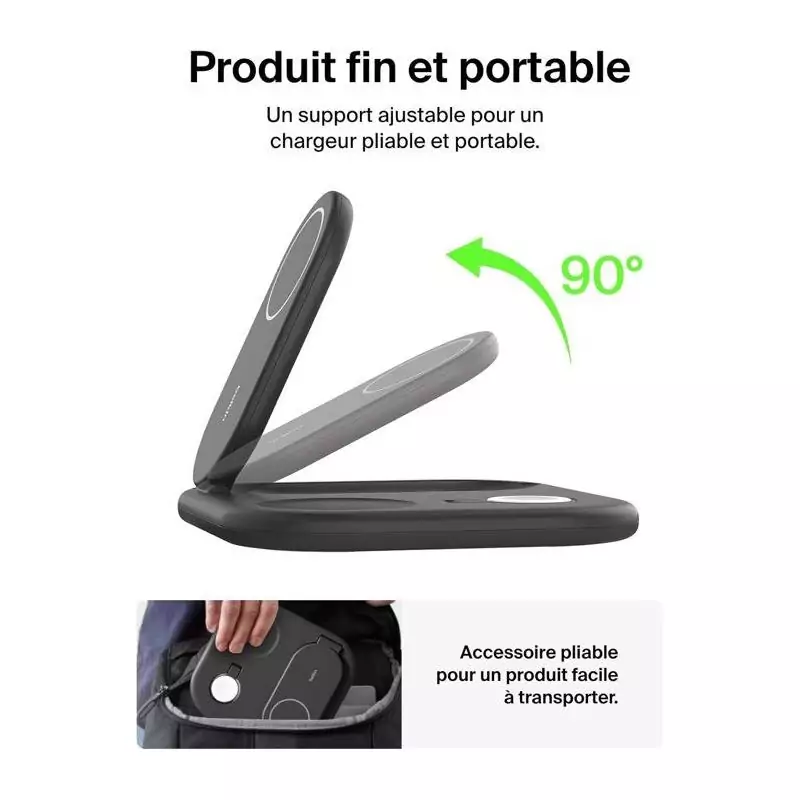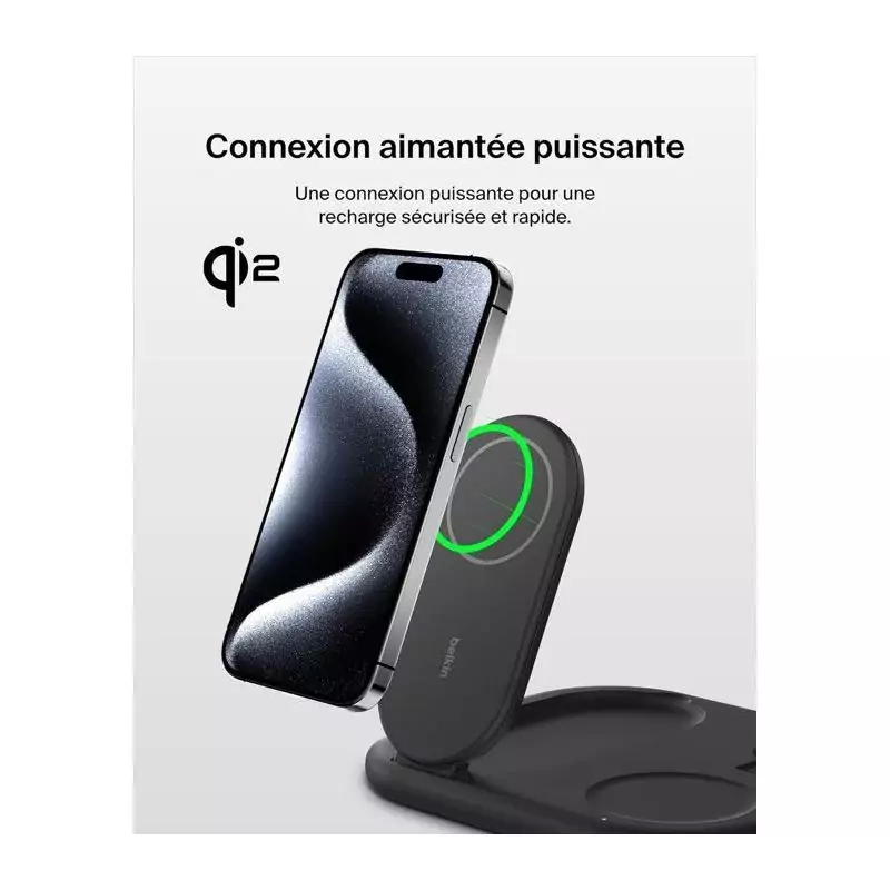 Le socle de recharge BELKIN Qi2 3-en-1 en noir est l'accessoire idéal pour garder vos appareils mobiles chargés et prêts à l'emploi. Ce chargeur téléphone polyvalent offre une solution pratique pour recharger jusqu'à trois appareils simultanément, avec une compatibilité universelle pour les smartphones et autres appareils compatibles Qi.