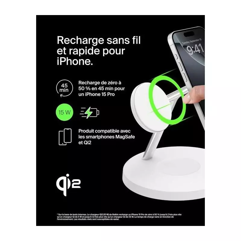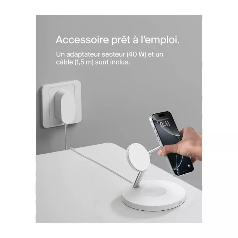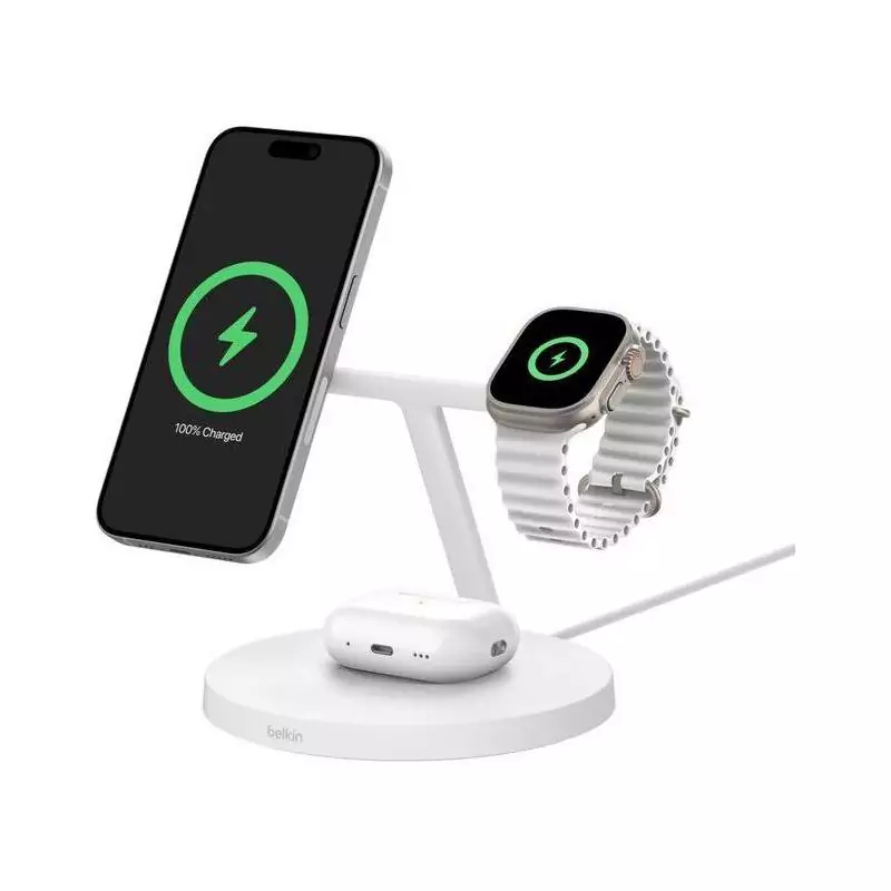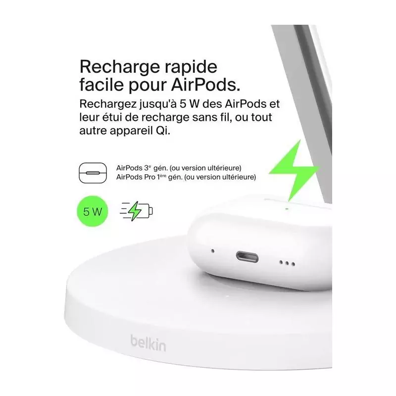 La Station de recharge BELKIN Qi1 3-en-1 est l'accessoire parfait pour tous vos besoins de charge. Ce chargeur téléphone polyvalent combine trois fonctions essentielles en un seul appareil élégant et pratique.