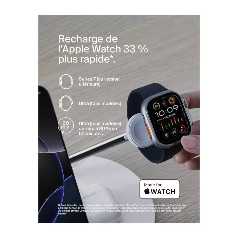 Avec une puissance de 15 W, cette station de recharge sans fil rapide vous permet de recharger votre smartphone, vos écouteurs sans fil et votre montre connectée simultanément et rapidement. Fini les câbles emmêlés et les prises multiples !