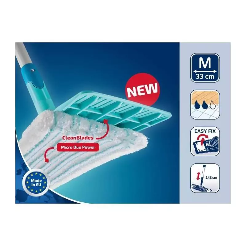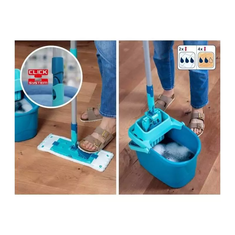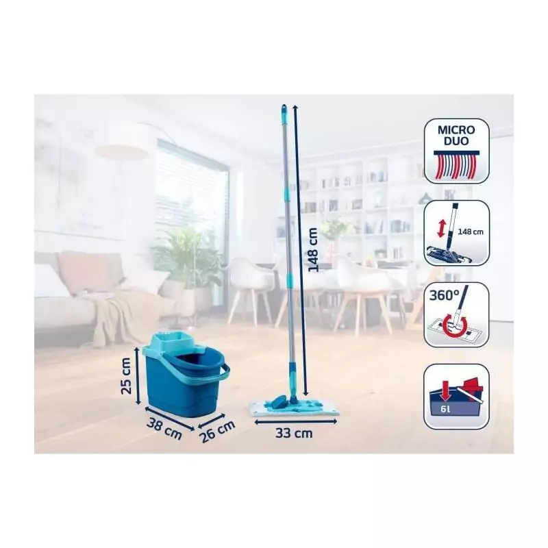 Grâce à sa conception ergonomique et ses matériaux de qualité, ce set de nettoyage vous assure une prise en main confortable et une grande durabilité. Le balai serpillère est idéal pour tous types de sols, qu'il s'agisse de carrelage, de parquet ou de linoléum. Avec sa housse micro duo, il capture efficacement la saleté et les particules pour des sols parfaitement propres.
