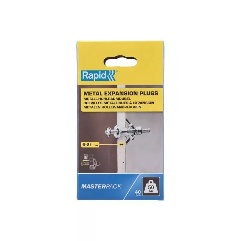 Le produit RAPID - Chevilles à Expansion Métal pour Cloison Plâtre 6-21mm | Lot 40 | Charge Max 50 kg | - (5001567) est une solution de fixation idéale pour les cloisons en plâtre. Avec un lot de 40 chevilles à expansion en métal, vous pouvez être assuré d'avoir suffisamment de fixations pour vos besoins de bricolage ou de construction.
