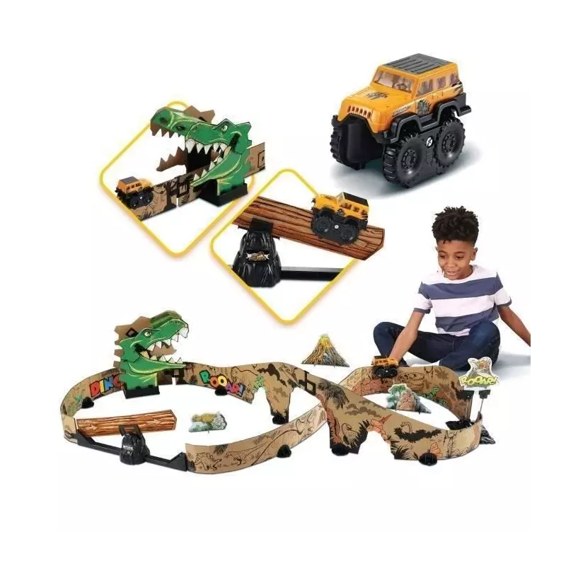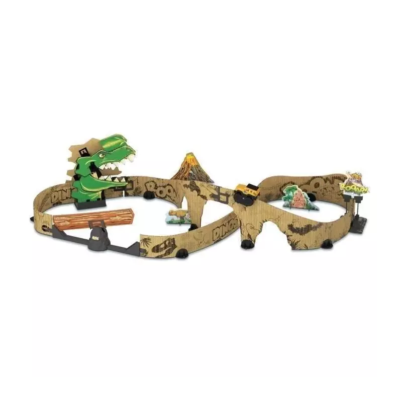 Un circuit cartonné de près de 4m sur la thématique des dinosaures avec véhicule et décors inclus !