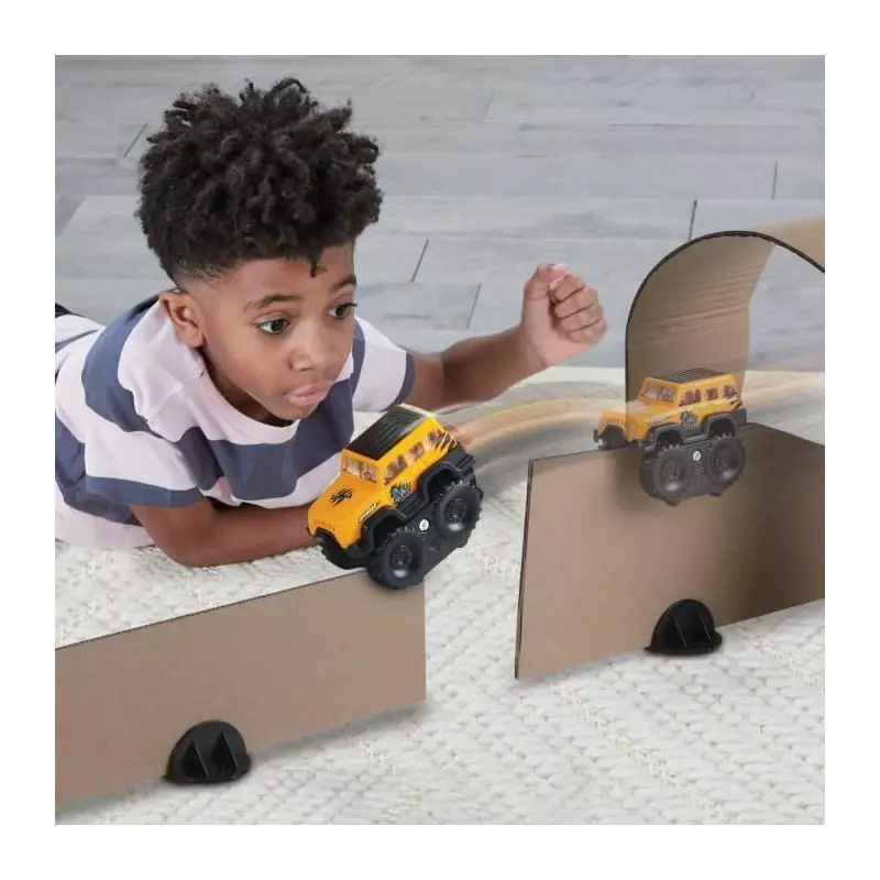 La voiture tout-terrain ncluse est motorisée et roule sur les arêtes des cartons pour parcourir le circuit et déjouer les obstacles. Ses phares arrières sont lumineux.