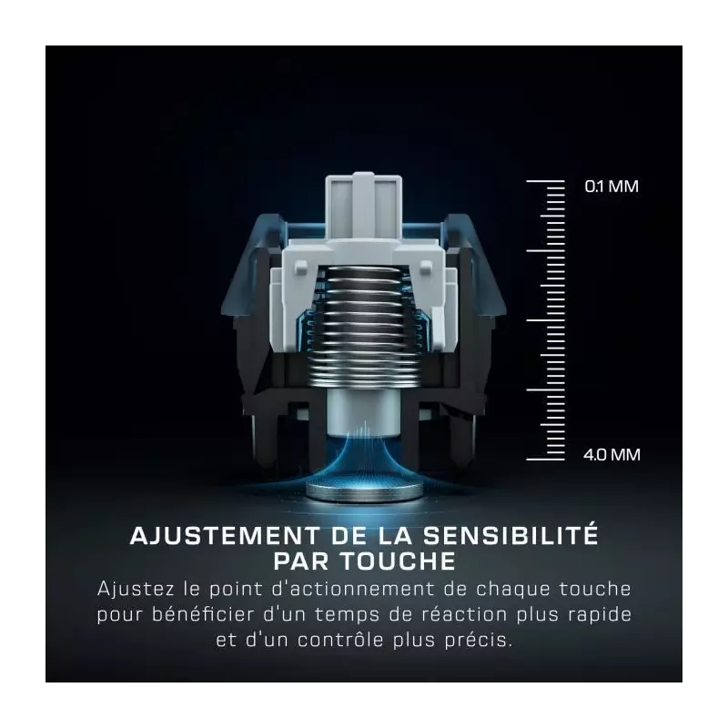 Technologie magnétique révolutionnaire Pour la toute première fois dans la ligne légendaire de claviers Vulcan, le Vulcan II TKL Pro est équipé de commutateurs magnétiques ajustables à effet Hall analogique pour des appuis ultra-fluides sur les touches, et d'une personnalisation étendue. Dotés d'un cycle de vie de 150 millions de clics, les commutateurs pré-lubrifiés à effet Hall sont conçus pour être durables, et les touches en T sont compatibles avec des touches du commerce pour une personnalisation sans limites. La caractéristique révolutionnaire réside dans les points d'actionnement ajustables : de 0,1 mm à 4 mm, vous pouvez ajuster toutes les touches, ensemble ou séparément, avec une distance de course plus courte pour bénéficier d'un temps de réaction plus rapide dans les jeux de tir, ou avec une distance plus longue pour un contrôle plus précis et volontaire. De plus, chaque touche possède 40 hauteurs préréglées, de 0,1 mm à 4 mm, avec jusqu'à trois entrées par touche. Pour plus de commodité, vous pouvez les ajuster toutes ensemble, avec le clavier, ou individuellement dans le logiciel Swarm™ II. Le Vulcan II TKL Pro possède également un réglage Rapid Trigger qui vous permet d'appuyer sur les touches et de les relâcher plus rapidement, en levant le doigt au minimum, pour des mouvements plus précis et une visée plus rapide. Et avec l'Anti-Ghosting avancé, vous pouvez jouer en sachant que chaque appui sur une touche sera enregistré de manière fiable, même lorsque vous appuyez sur plusieurs touches simultanément.
