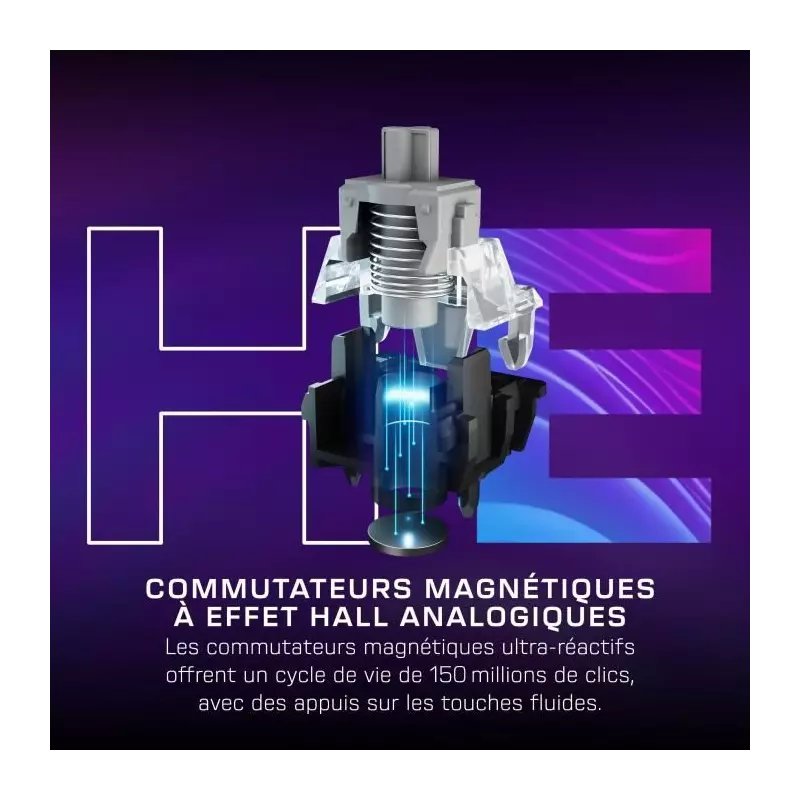 Commutateurs magnétiques à effet Hall analogiques Les commutateurs magnétiques ultra-réactifs offrent un cycle de vie de 150 millions de clics, avec des appuis sur les touches fluides et des fonctionnalités telles que Rapid Trigger, l'émulateur de manette, l'actionnement multi-point ajustable et plus encore.