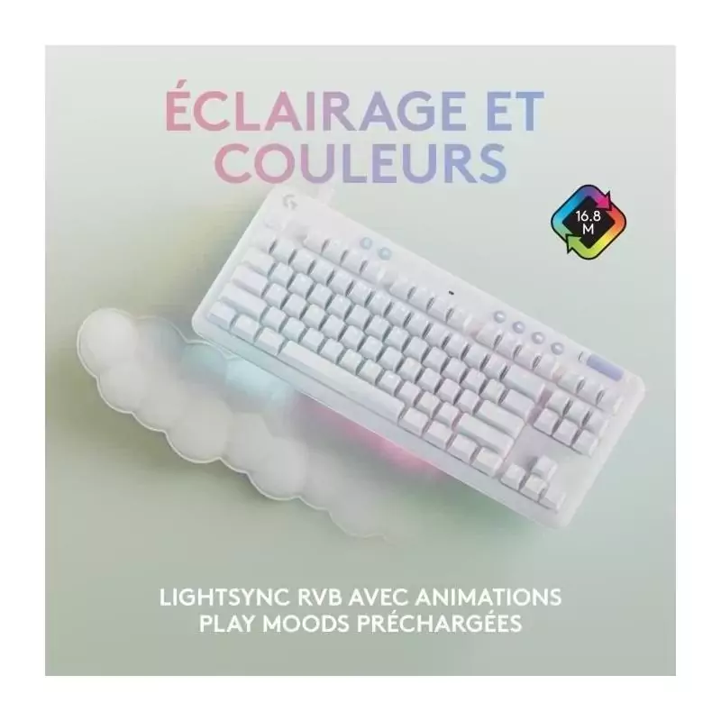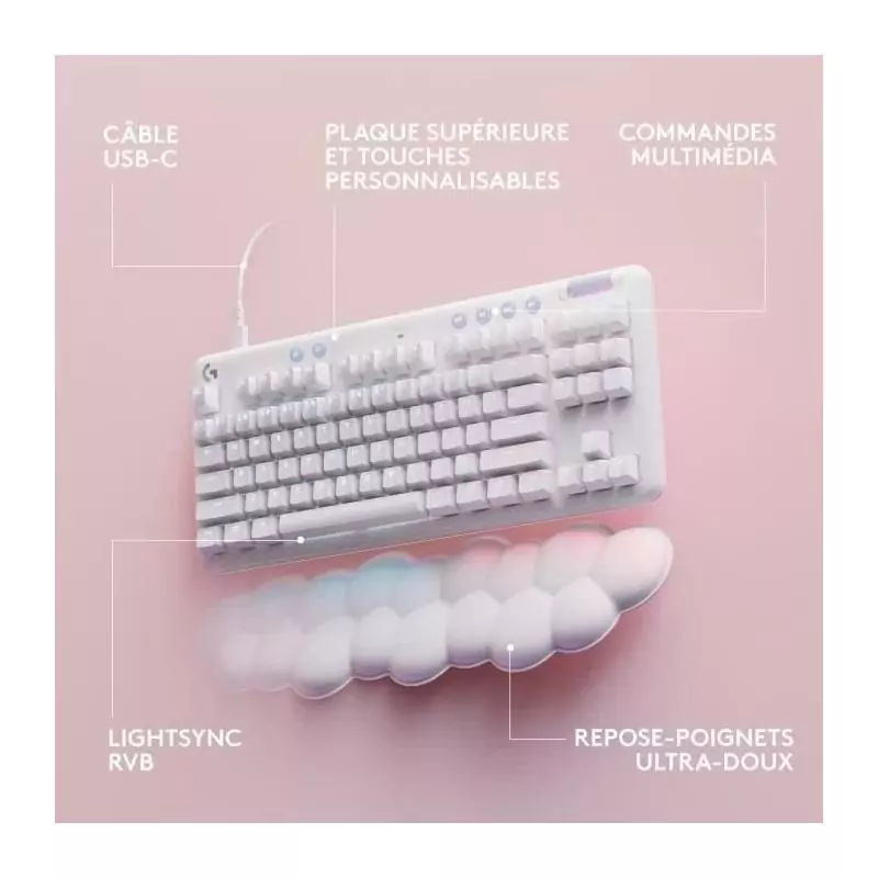 Doté de switchs mécaniques GX Brown, ce clavier gaming offre une sensation tactile précise et silencieuse, idéale pour les joueurs exigeants. Le repose-poignet intégré assure un confort optimal même lors de longues sessions de jeu. De plus, la couleur blanche de ce modèle ajoute une touche élégante à votre setup de jeu.