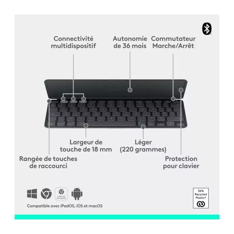 L'étui clavier Logitech Keys to go 2 est non seulement élégant et fonctionnel, mais il est également extrêmement durable grâce à sa construction de haute qualité. Léger et mince, il se glisse facilement dans votre sac pour que vous puissiez l'emporter partout avec vous.