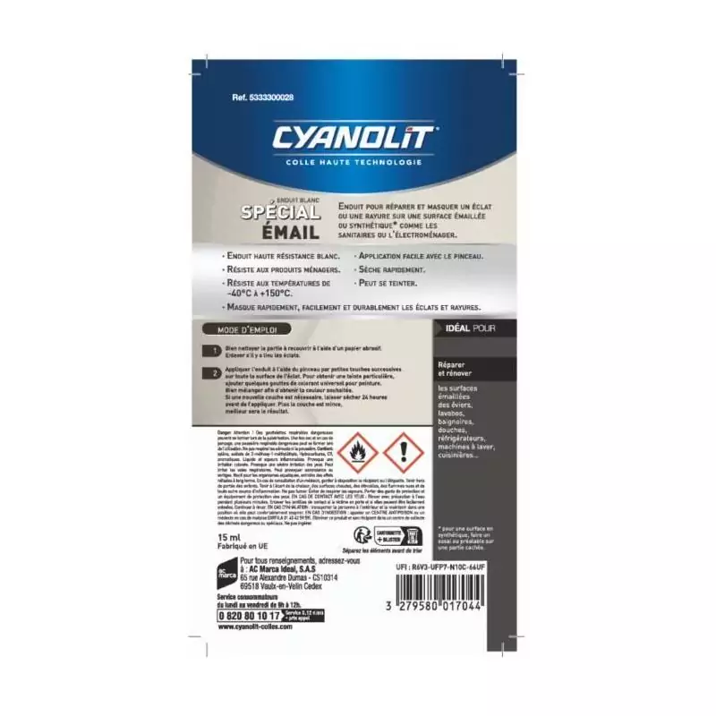 L'enduit spécial email de la marque CYANOLIT est un produit de haute qualité conçu pour la réparation et la finition des surfaces émaillées. Avec sa contenance de 15 ml, ce produit est idéal pour les petites réparations ou retouches sur des objets en émail tels que des éviers, des baignoires, des carrelages ou des appareils électroménagers.