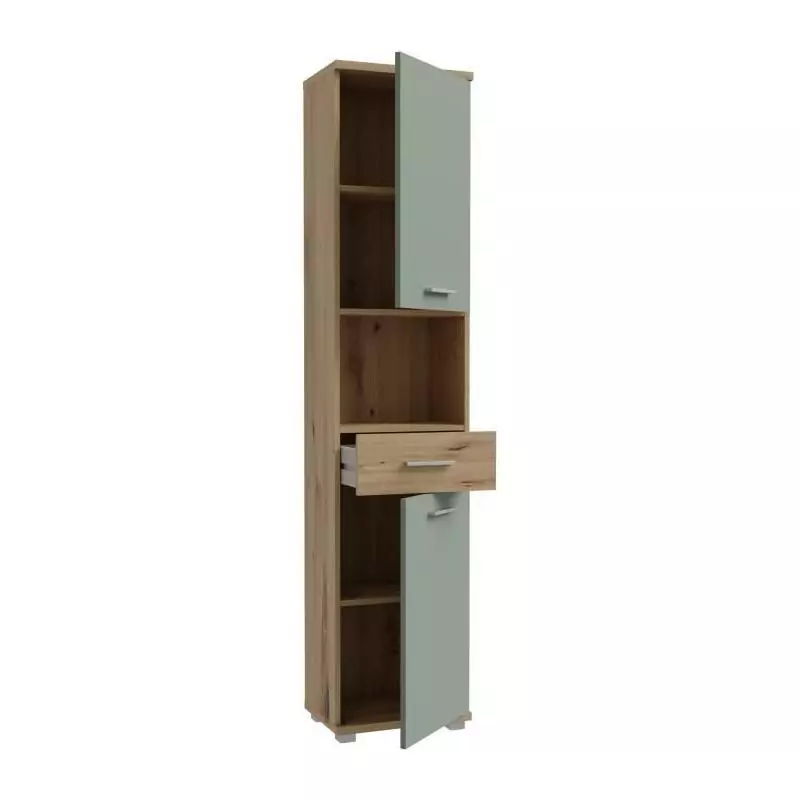 Mesurant 40,2 x 28,9 x 183,6 cm, cette colonne est idéale pour les petites salles de bain grâce à sa conception compacte qui maximise l'espace de rangement sans encombrer la pièce. Le chêne artisan confère à ce meuble une robustesse et une durabilité exceptionnelles, tandis que la finition vert sauge apporte une touche de modernité et d'élégance.