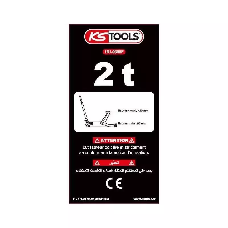 Cric hydraulique - KS TOOLS - 161.0365F - Cric 2 tonnes - Leve voiture compact en aluminium/acier - Cric rouleur