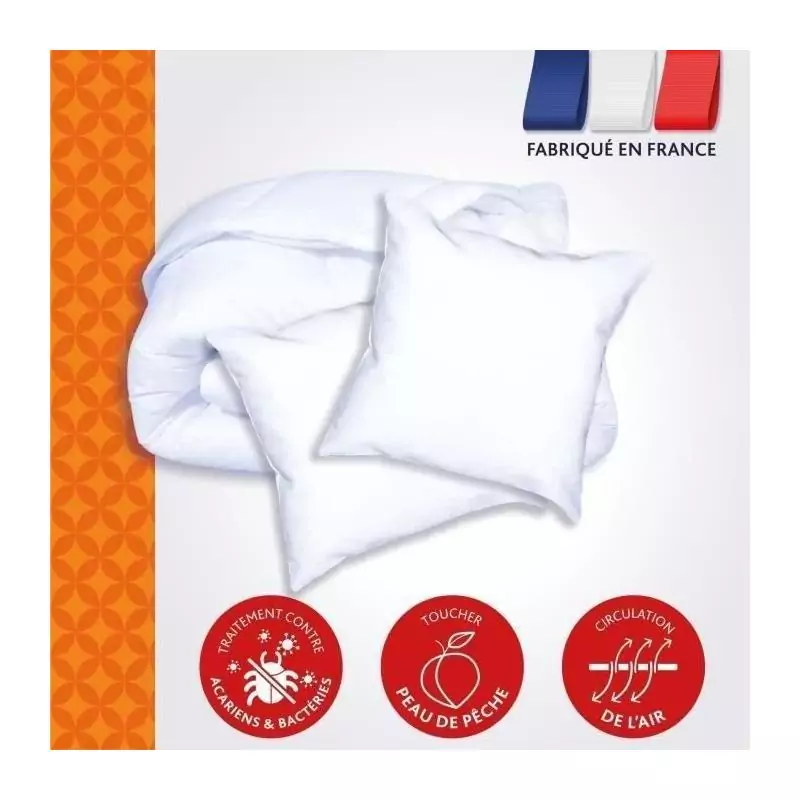DODO Pack Couette chaude anti-acariens 220x240 cm + 2 oreillers 60x60 cm - Splendeur - Garnissage 100% volupt'air 350gr/m² - Bl