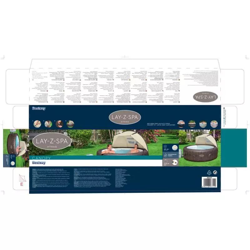 Bestway Lay-Z-Spa 6' x 37" x 43"/1.83m x 94cm x 1.09m Canopy. Type de produit: Verrière, Compatibilité de marque: Bestway, Couleur du produit: Beige. Largeur: 940 mm, Profondeur: 1830 mm, Hauteur: 940 mm. Type d'emballage: Emballage coloré, Largeur du colis: 80 mm, Profondeur du colis: 640 mm. Produit par casier d’expédition (interne): 3 pièce(s), Longueur du casier principal (externe): 640 mm, Largeur du casier principal (externe): 280 mm