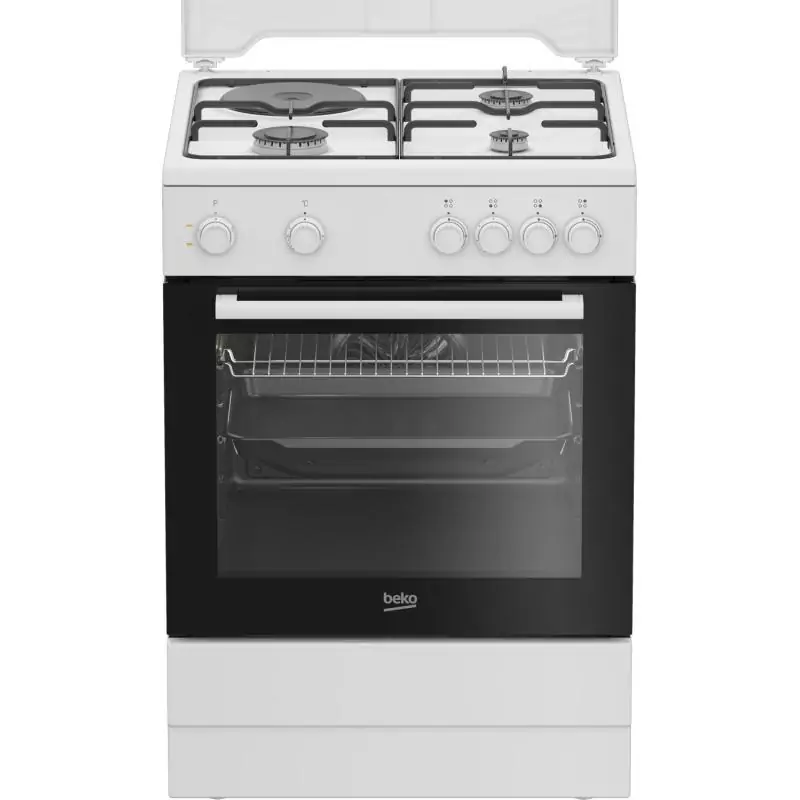 Beko FBS63121WD. Type de produit: Cuisinière, Couleur du produit: Blanc, Type de commande: Rotatif. Type de plaque: Combi, Nombre de brûleurs: 4 zone(s), Type de gaz: Gaz naturel. Taille du four: Moyenne, Source d'alimentation du four: Electrique, Capacité nette du four: 73 L. Classe d'efficacité énergétique: A, Consommation d'énergie (conventionnelle): 0,82 kWh, Puissance raccordée (électrique): 3800 W. Largeur: 600 mm, Profondeur: 600 mm, Hauteur: 850 mm