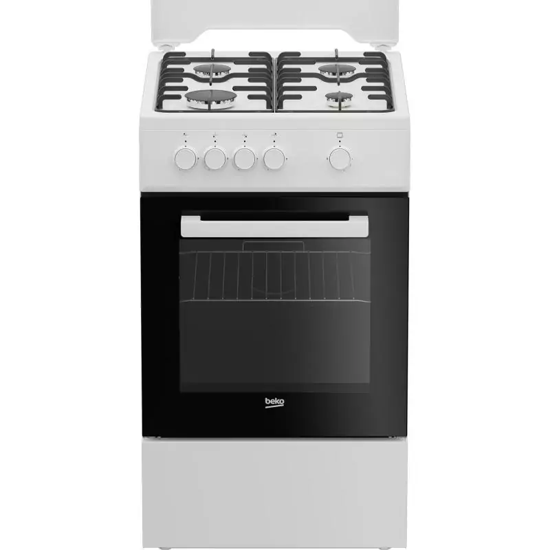 Beko FSG522DWC. Type de produit: Cuisinière, Couleur du produit: Noir, Blanc, Type de commande: Boutons, Rotatif. Type de plaque: Gaz, Nombre de brûleurs: 4 zone(s), Type de surface extérieure (dessus): acier émaillé. Taille du four: Moyenne, Source d'alimentation du four: Gaz, Capacité nette du four: 55 L. Puissance raccordée (gaz): 10400 W. Largeur: 500 mm, Profondeur: 600 mm, Hauteur: 850 mm