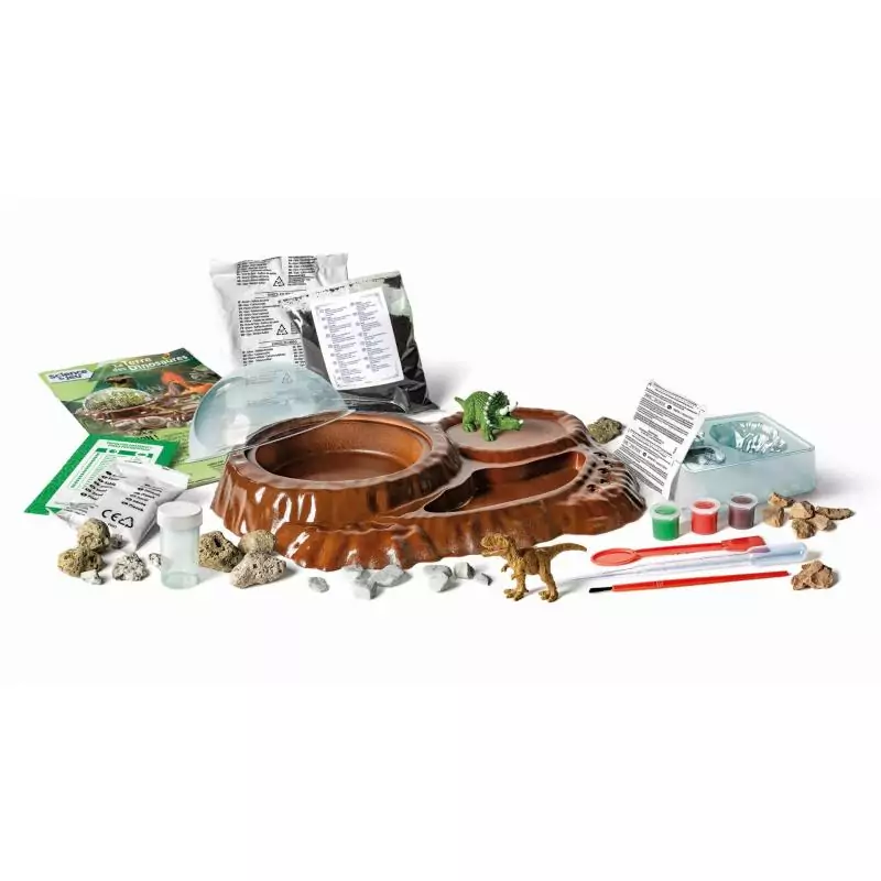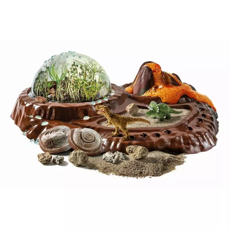 • Un terrarium préhistorique à assembler et à personnaliser pour recréer le monde des dinosaures ! • Contient des figurines de T-Rex et de Tricératops, pour jouer et reconstruire l'environnement dans lequel ils vivaient. • Fais pousser des plantes et recrée un environnement jurassique avec les roches volcaniques incluses. • Le coffret comprend un moule pour reproduire un volcan et des fossiles en plâtre à créer et à peindre.