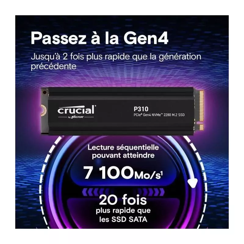 Ne laissez plus la lenteur de votre disque dur limiter vos activités. Optez pour le CRUCIAL - P310 et profitez de performances inégalées, d'une fiabilité à toute épreuve et d'une capacité de stockage massive. Upgradez dès aujourd'hui et découvrez la différence que peut faire un SSD de qualité supérieure dans votre quotidien numérique.