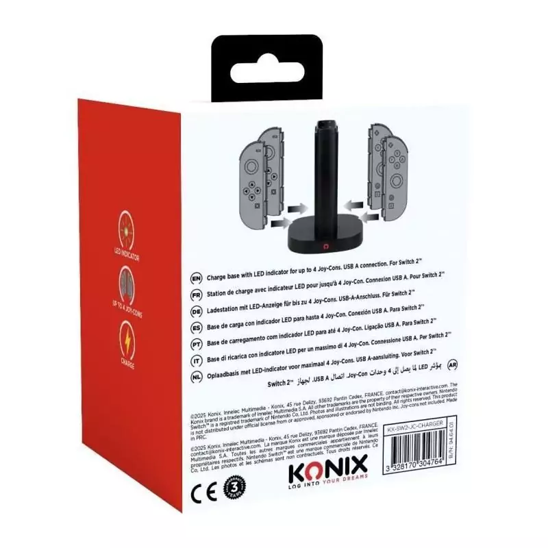 Découvrez la station de rechargement KONIX pour manettes Joy-Con, idéale pour les amateurs de jeux Nintendo Switch.