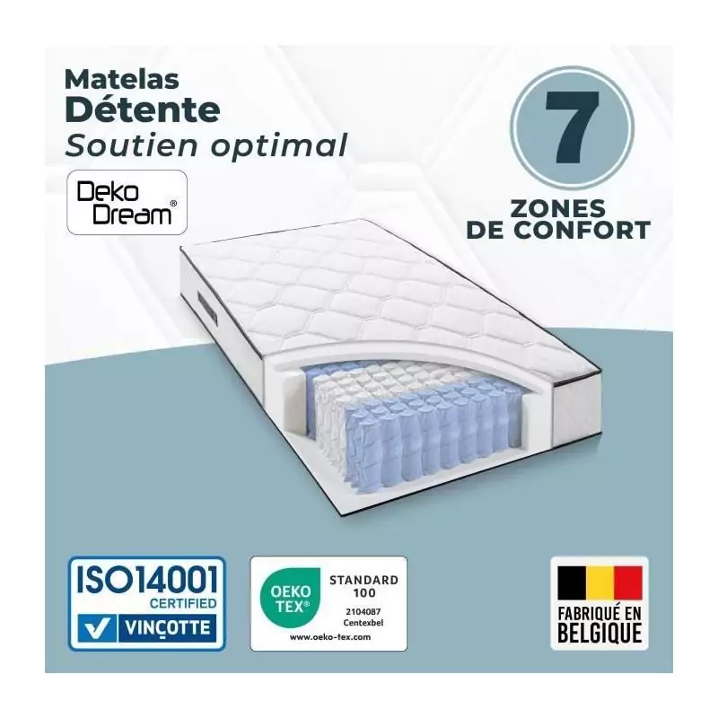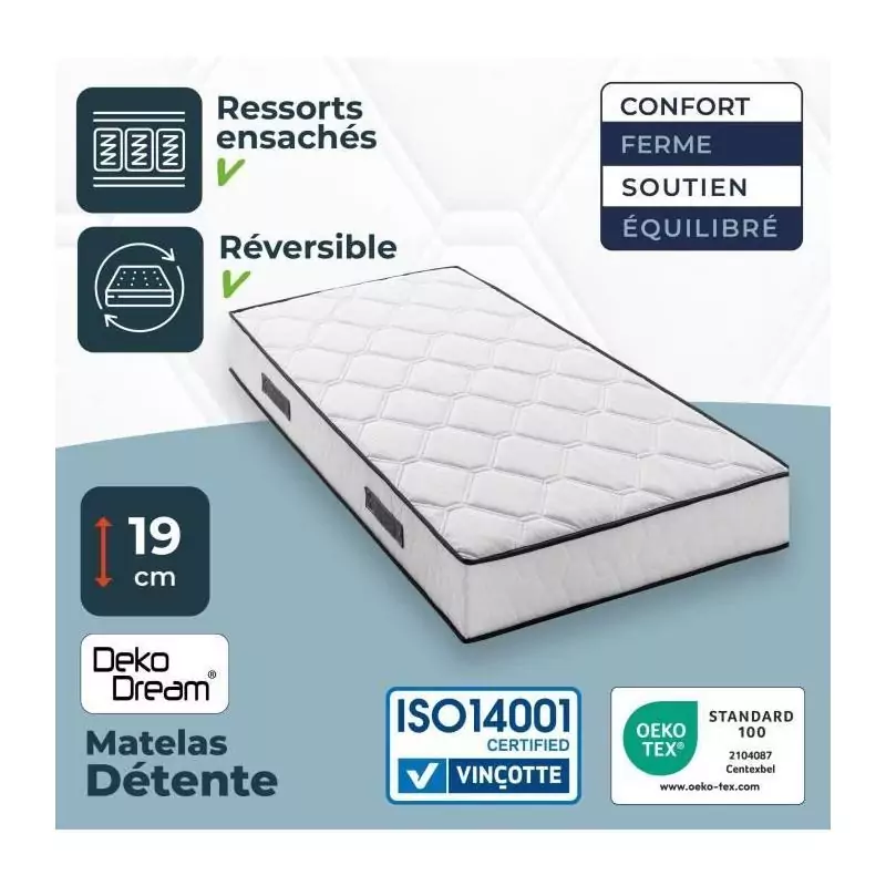 Ensemble matelas sommier 90 x 190 cm Hauteur 19 cm - ressorts ensachés - 7 zones - réversible - fabriqué en Belgique - DEKO D