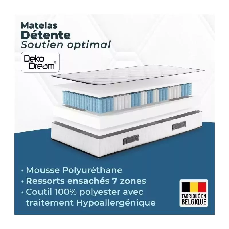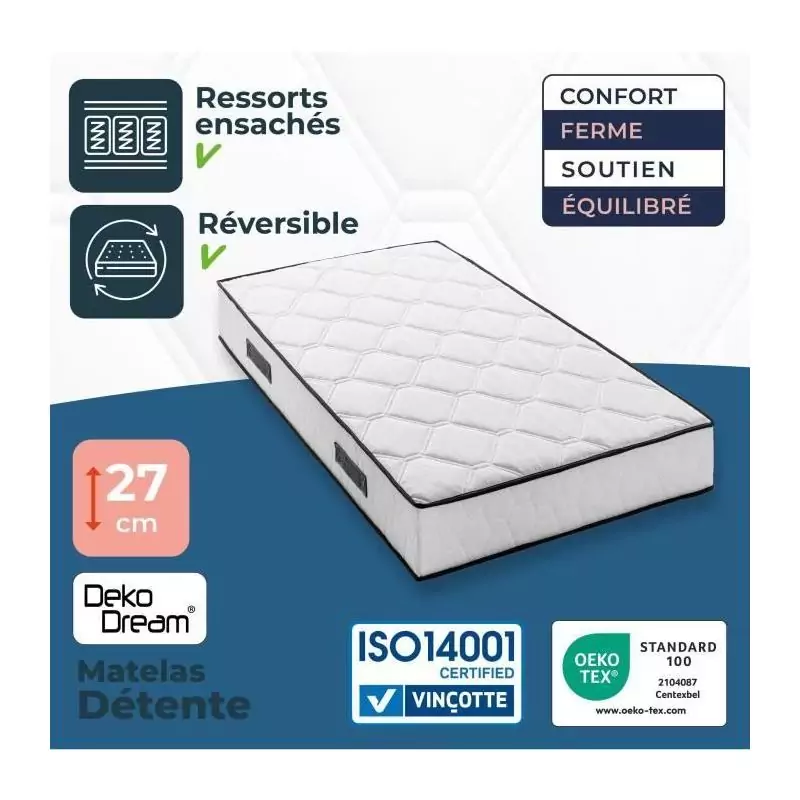 Ensemble matelas sommier 90 x 200 cm Hauteur 27 cm - ressorts ensachés - 7 zones - réversible - fabriqué en Belgique - DEKO D