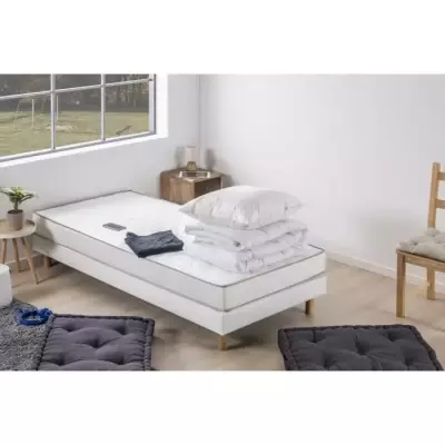 Offrez-vous le luxe d'un sommeil de qualité avec le Pack prêt à dormir Matelas 90x190 cm + Sommier + Couette + 1 oreiller 60x60 cm - 14 cm - DEKO DREAM TOP. Transformez votre chambre en un havre de paix où le confort et le bien-être sont prioritaires. Profitez dès maintenant de nuits paisibles et réparatrices avec ce pack tout-en-un exceptionnel.