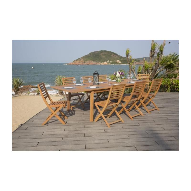 Les 8 chaises assorties offrent un confort optimal grâce à leur assise spacieuse et leur dossier ergonomique. Fabriquées dans le même bois d'Eucalyptus certifié FSC, elles s'accordent parfaitement avec la table pour créer une harmonie visuelle dans votre jardin ou sur votre terrasse.