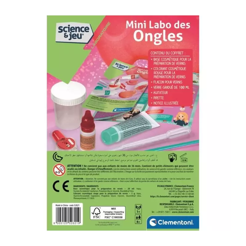 Découvrez le Mini Labo des ongles de Clementoni, un kit scientifique amusant qui permet aux enfants à partir de 8 ans de créer leur propre vernis à ongles! Parfait pour les petites filles curieuses, ce jeu encourage l'expérimentation et la créativité. Avec des instructions simples et des ingrédients sûrs, les enfants peuvent s'amuser tout en apprenant les bases de la chimie. Offrez-leur une expérience scientifique passionnante avec ce coffret ludique. Un cadeau idéal pour les jeunes esprits créatifs!