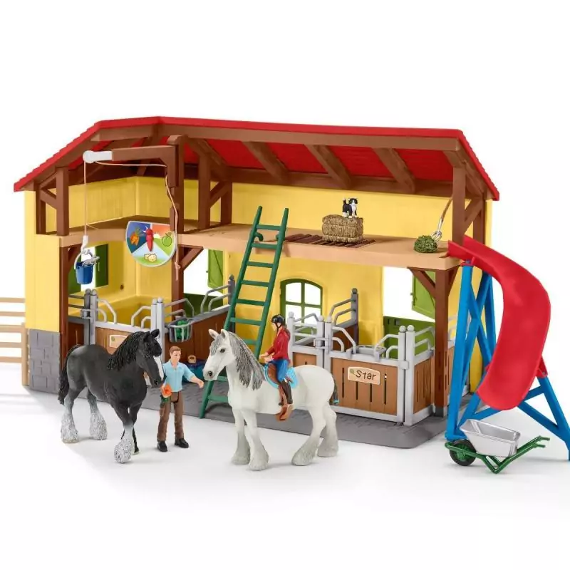 La nouvelle écurie multicolore offre différents jeux et garantit aux petits de longs moments de divertissement ! En effet, avec 7 adorables animaux, 2 box pour chevaux, les fermiers Paul et Laura et de nombreux accessoires, il n'y a rien de plus facile que de reproduire une journée à la ferme. Pendant que la fermière se prépare à partir en promenade, le fermier Paul entrepose du fourrage dans le grenier à foin à l'aide du palan. Les rouleaux de transport mobiles lui permettent toujours très facilement d'amener les bottes de foin jusqu'au toboggan à nourriture, depuis lequel elles atterrissent directement dans la brouette. Il est possible de régler précisément l'indicateur de repas des animaux. Le fermier a-t-il découvert la mignonne petite souris qui se cache dans le trou ? Les enfants peuvent personnaliser l'écurie comme bon leur semble grâce aux autocollants. Les figurines Schleich® sont modelées avec des détails pleins de réalisme pour des moments de jeu pédagogiques.