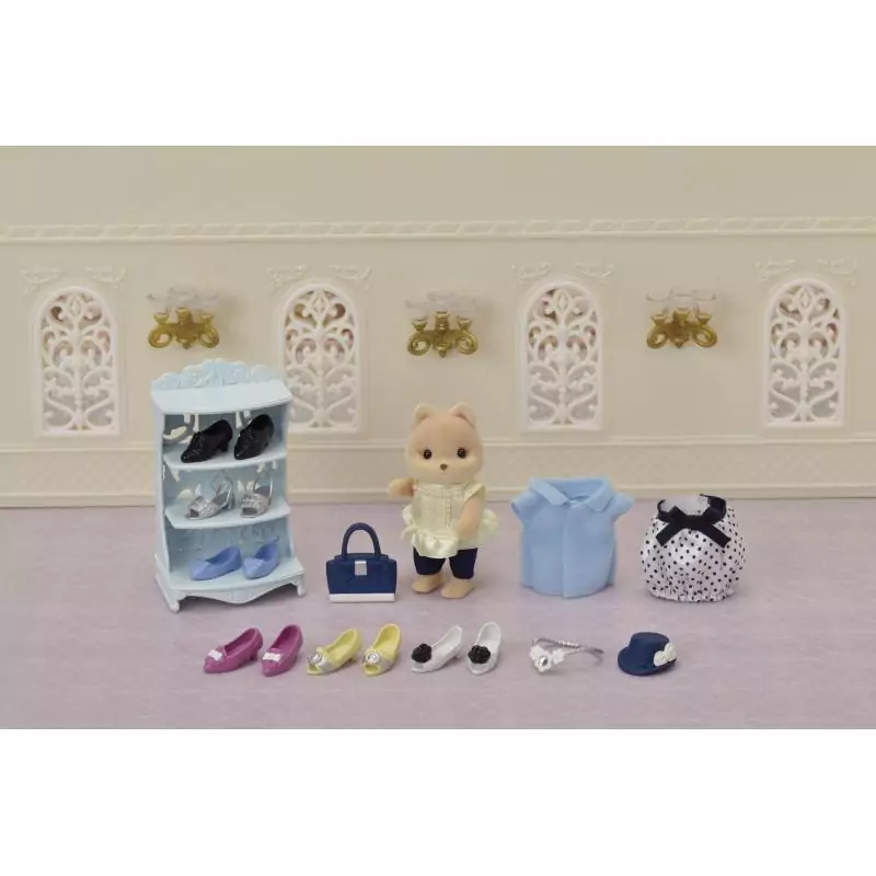La valisette de mode contient la grande sœur chien caramel et de nombreux vêtements et accessoires pour habiller les Sylvanian Families ! Amuse-toi à créer différentes tenues et imagine les combinaisons qui te plaisent. Une étagère permet de ranger les chaussures.